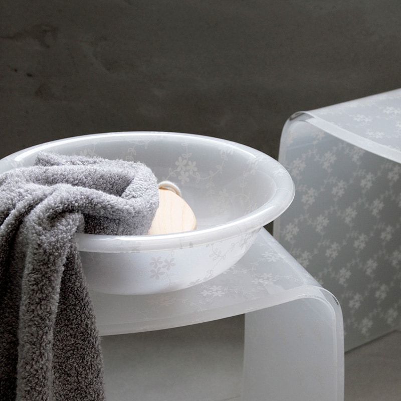「メルレット」(merletto)はイタリア語でレースの意味。その名のとおり、レースの花柄模様の清楚で清潔感のあるシリーズになりました。模様は白いレース調の生地をアクリルに挟み表現されています。そのため、模様がすり減って薄くなることはありません。クリアホワイトの色は、バスルームを明るく清潔感のある空間に演出します。構造はシンプルで丈夫。充分な厚みのあるアクリル一枚板で作られていてつなぎ目がないので、水垢などのお手入れも簡単。シンプルだから実現した美しいフォルムです。