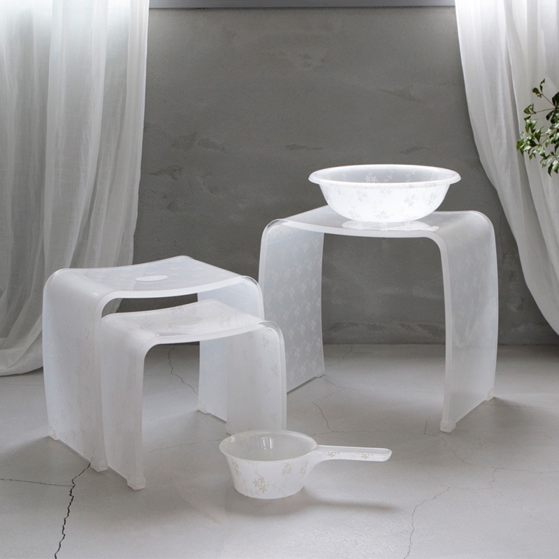 備考:アクリル板内部に特殊な繊維生地を挟み込んでいる商品です。このため、生産工程で行われる折り曲げ加工やプレス加工においてアクリル板に圧力がかかり、バスチェアの折り曲げた内側やバスボウルの底面などに、稀に繊維生地の凹凸が表面の一部に現れる場合があり、ザラザラとした感触がありますが、品質には問題ございませんので予めご了承ください。