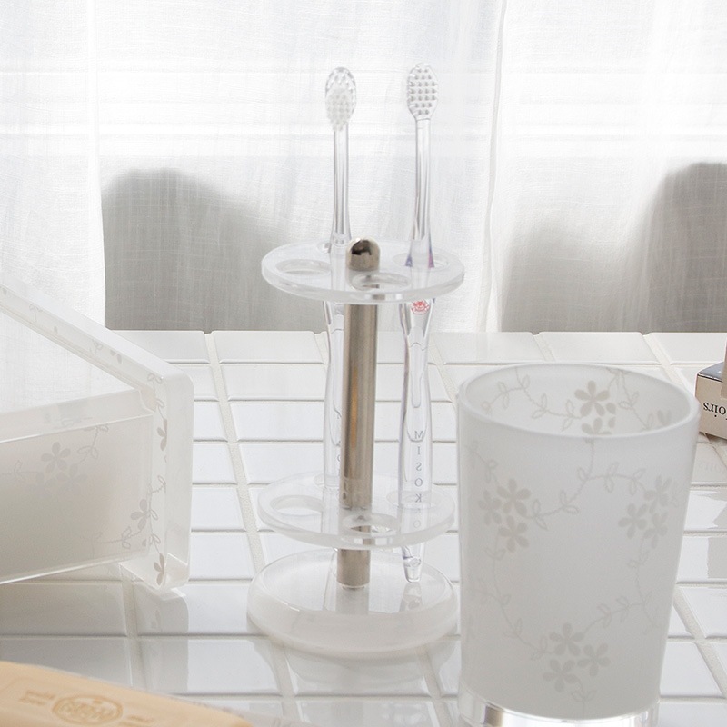 華やかな白いレース模様の生地をアクリルに挟み込んだ歯ブラシスタンド。4本収納可能