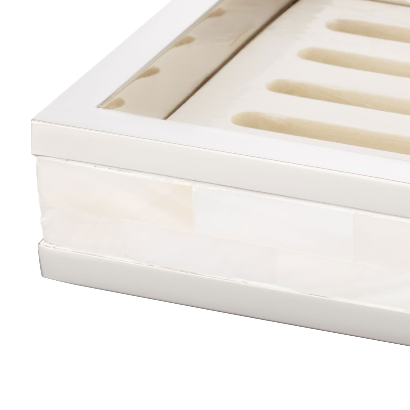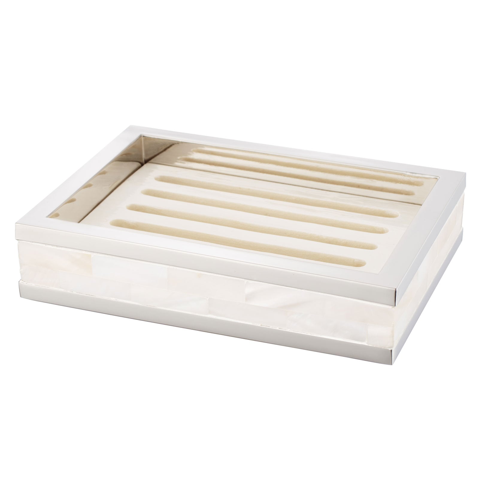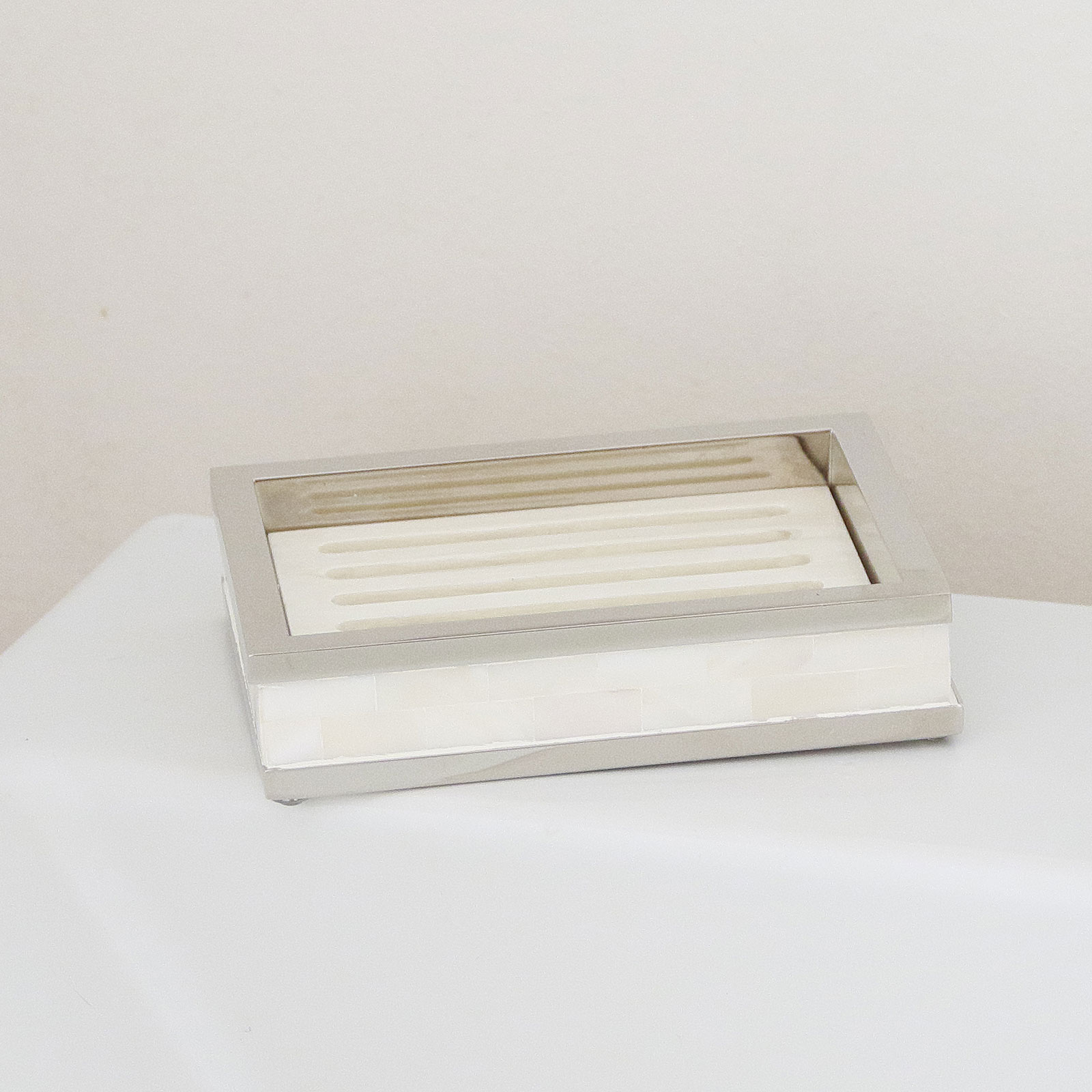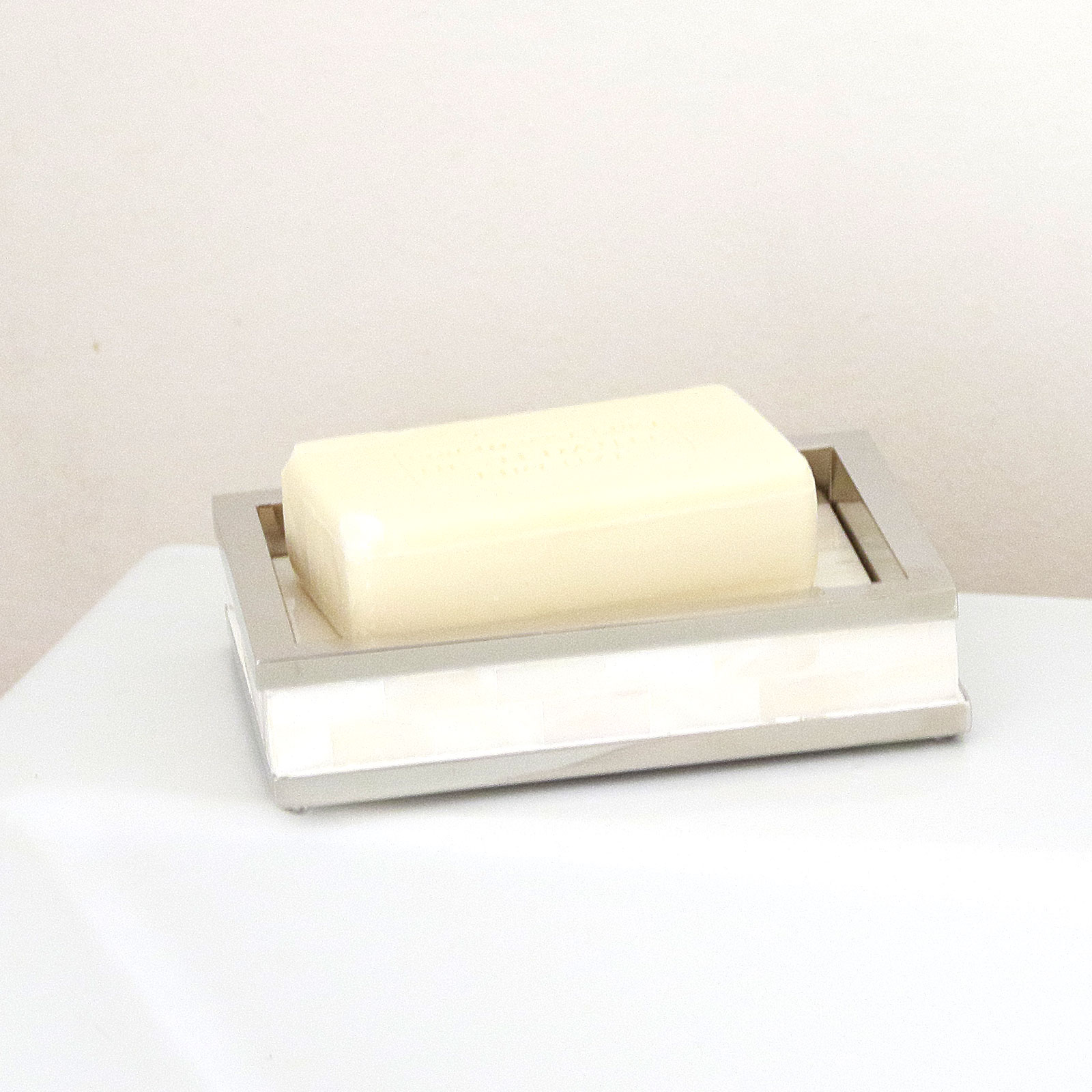 マザーオブパールをひとつひとつ貼り合わせて作った職人によるハンドメイドのせっけん置き。美しく、人のぬくもりを感じる仕上がり。 |