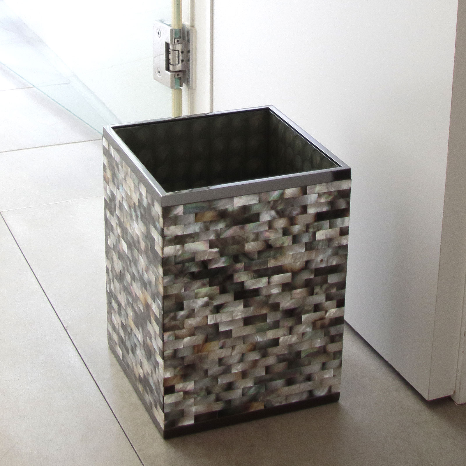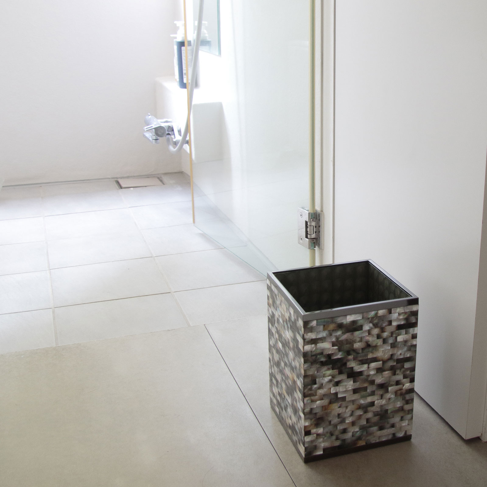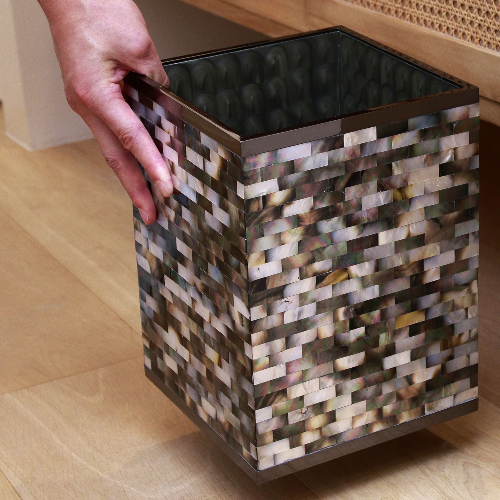 マザーオブパールをひとつひとつ貼り合わせて作った職人によるハンドメイドのダストボックス。美しく、人のぬくもりを感じる仕上がり。 |
