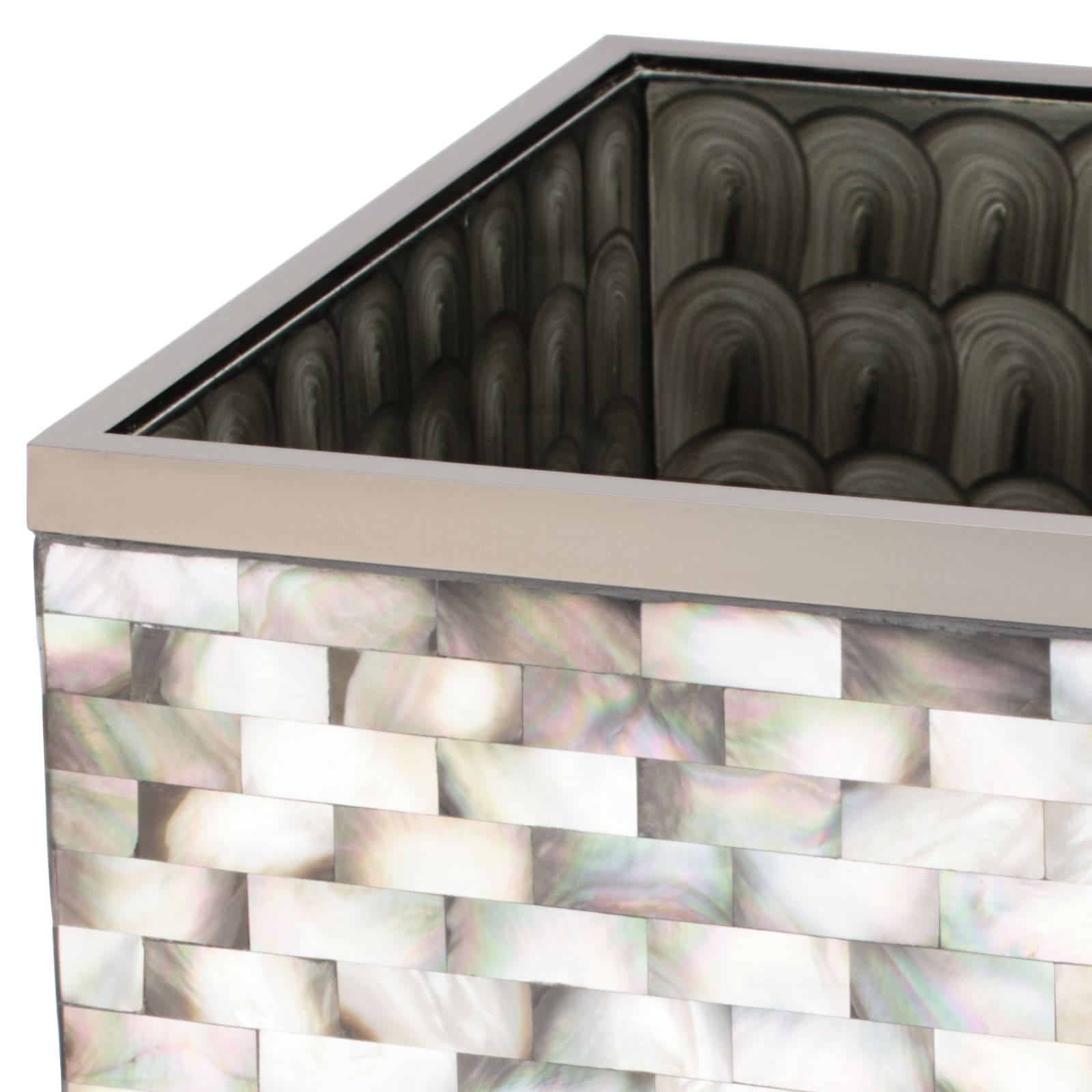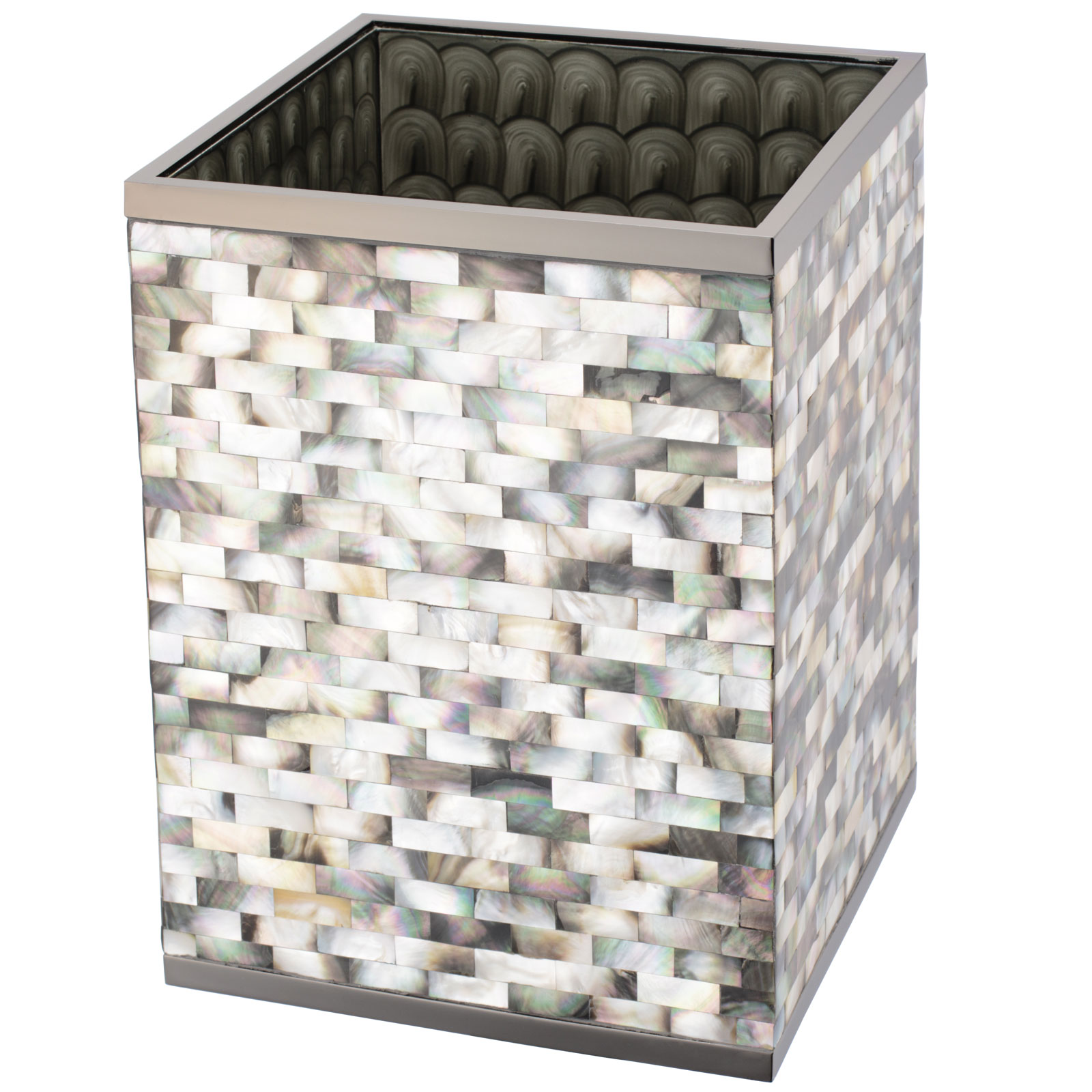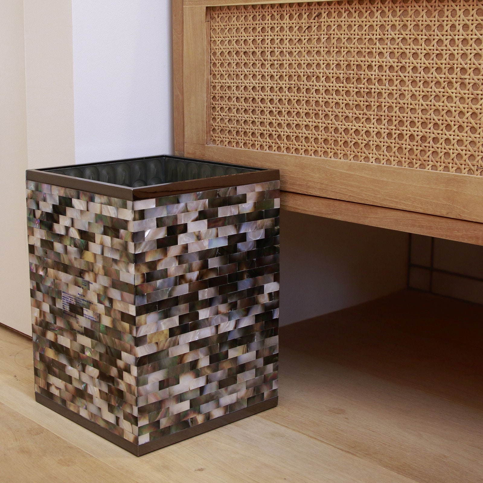 マザーオブパールをひとつひとつ貼り合わせて作った職人によるハンドメイドのダストボックス。美しく、人のぬくもりを感じる仕上がり。 |