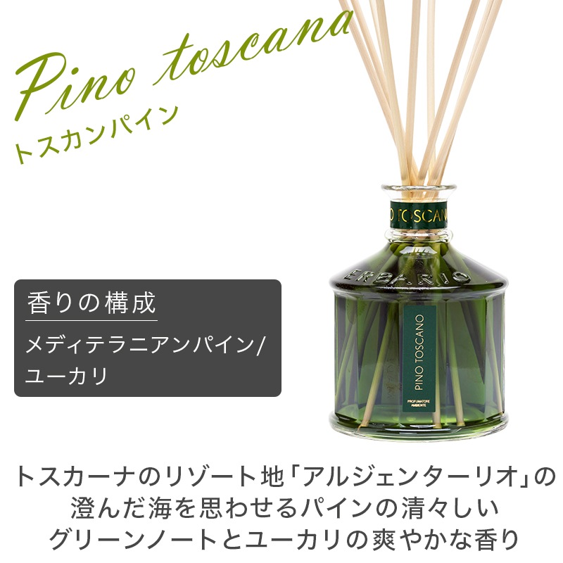トスカーナのリゾート地、アルジェンターリオの澄んだ海風に吹かれた松の葉の香りが、 まるで深緑の松林の中にいるかのような深いリラックスをもたらします。 メディテラニアンパイン(地中海松)のシャープで清々しいグリーンノートとユーカリの爽やかな香り。