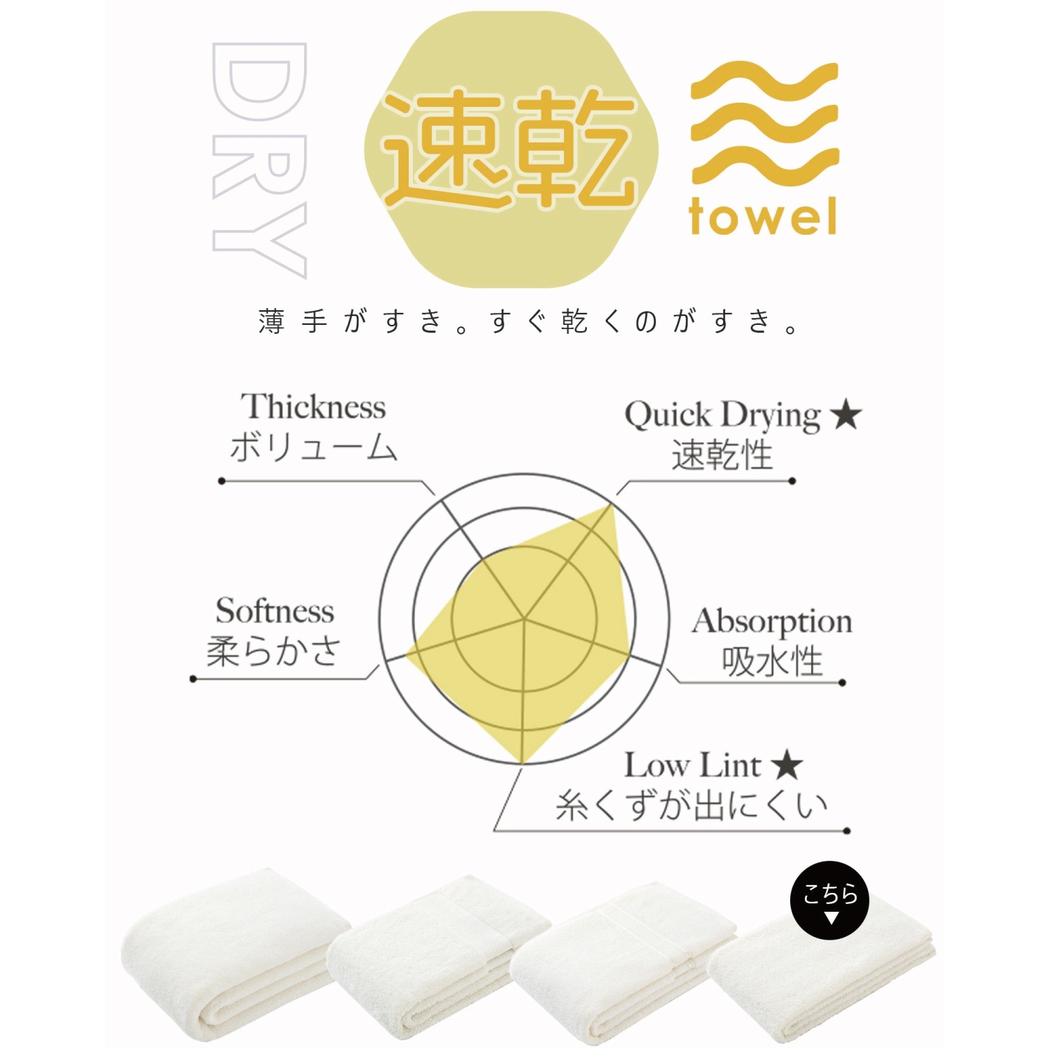 デイリーズタオル DRYを使えば、快適なバスタイムがさらに充実します。朝の時間短縮やスポーツ後の手軽な水分吸収にもピッタリ。毎日の生活をより快適にする便利なアイテムです。大切な方への贈り物にも最適で、喜ばれること間違いなし!※ご家庭用はもちろん、ギフトとしても最適です。