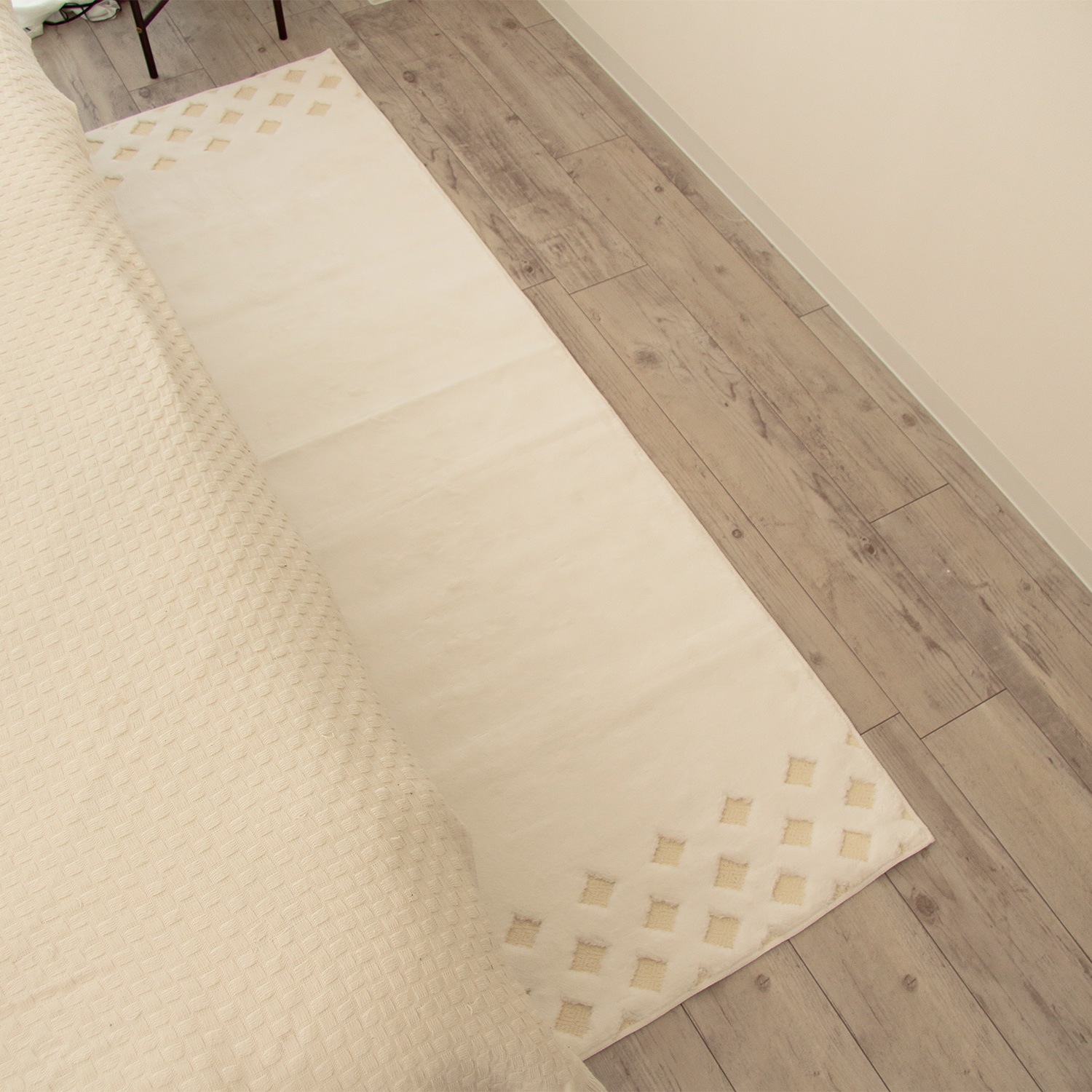 ・裏にスベリ止め加工をしている商品は、軟質の床材、特に塩化ビニール製の床材には、使用しないでください。化学反応によって床面に付着する場合があります。また連続して長時間敷いたり、商品の表面に家具の脚など荷重がかかりますと床面や裏面が変色したリスベリ止め素材が付着する場合がありますので一週間に一度は床面を拭き乾燥させてから敷いてください。