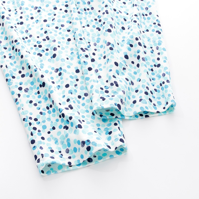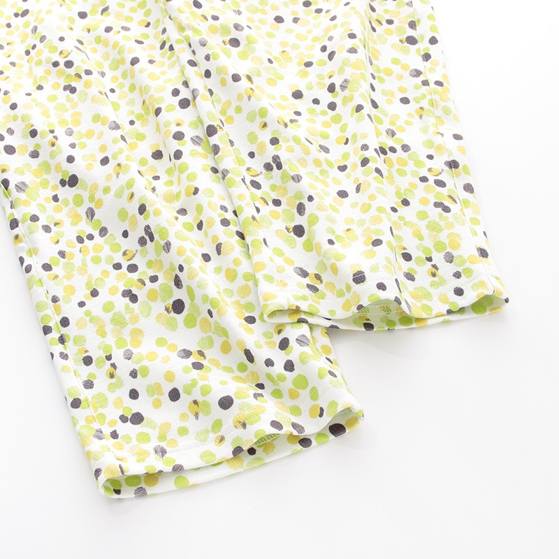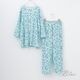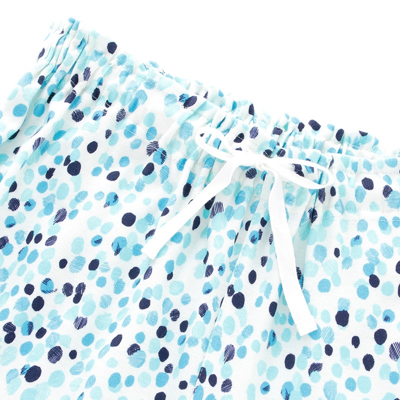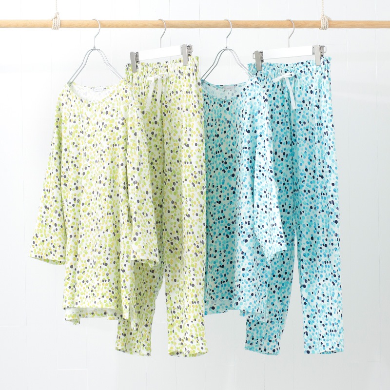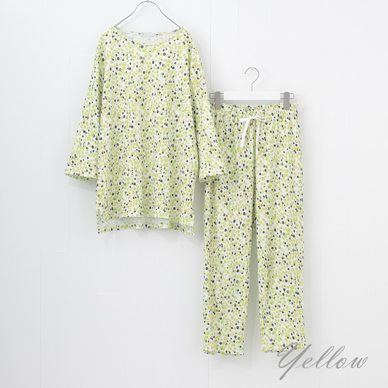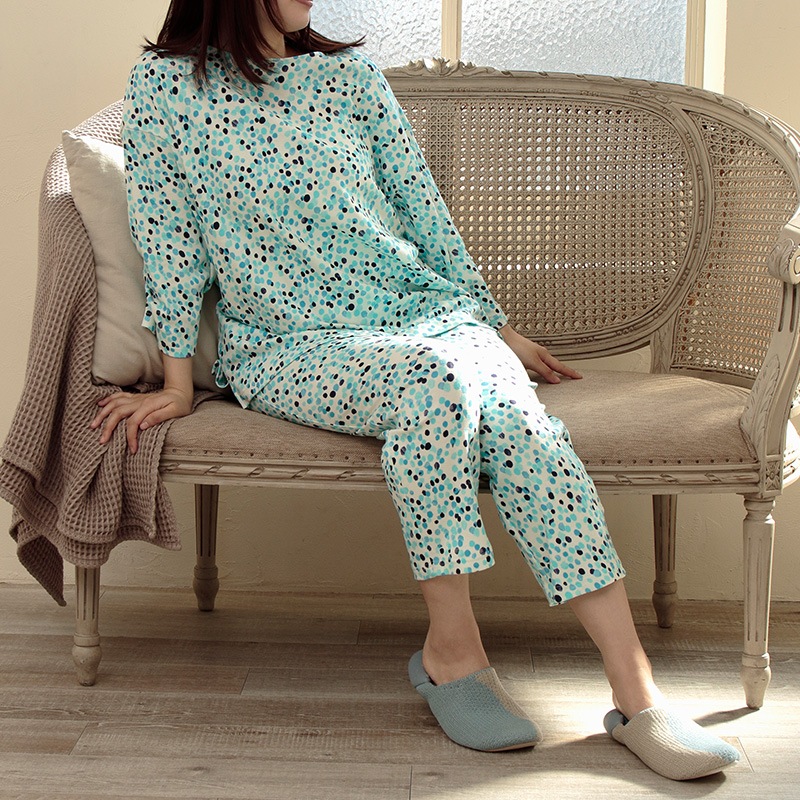 トップスは、程よい長さの七分袖。ロングパンツにはウエスト調節用のベルト紐が付いたベーシックなパジャマスタイルです。
