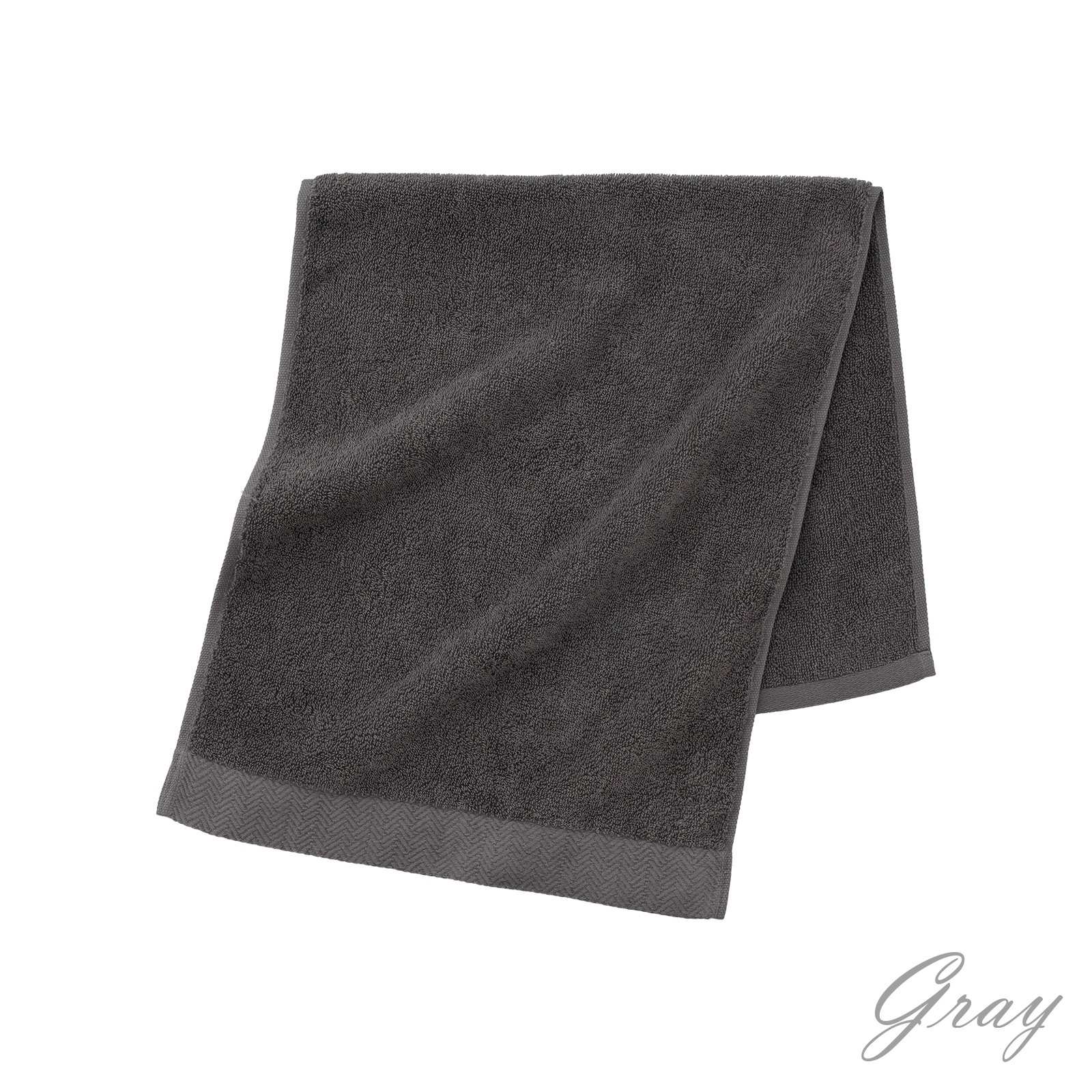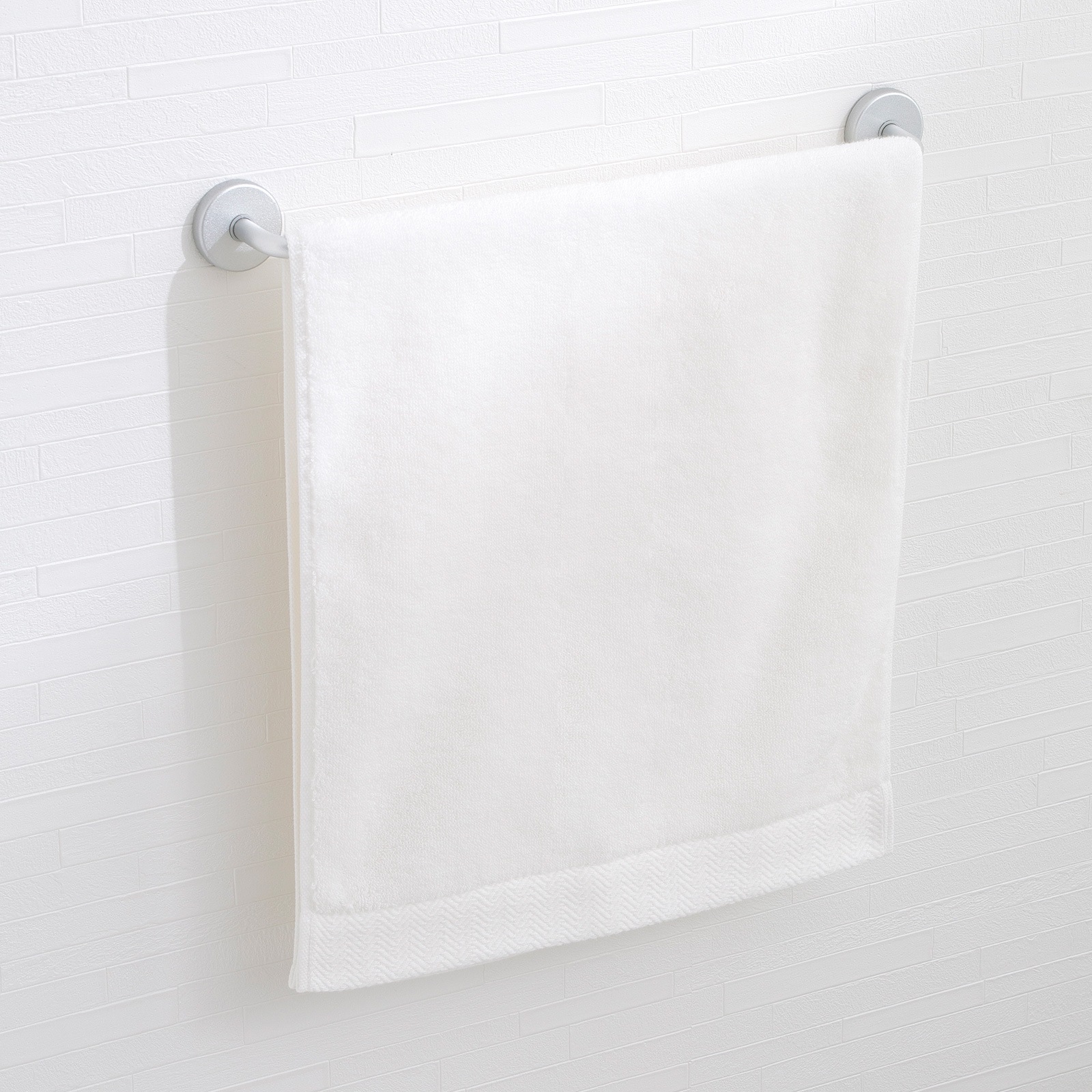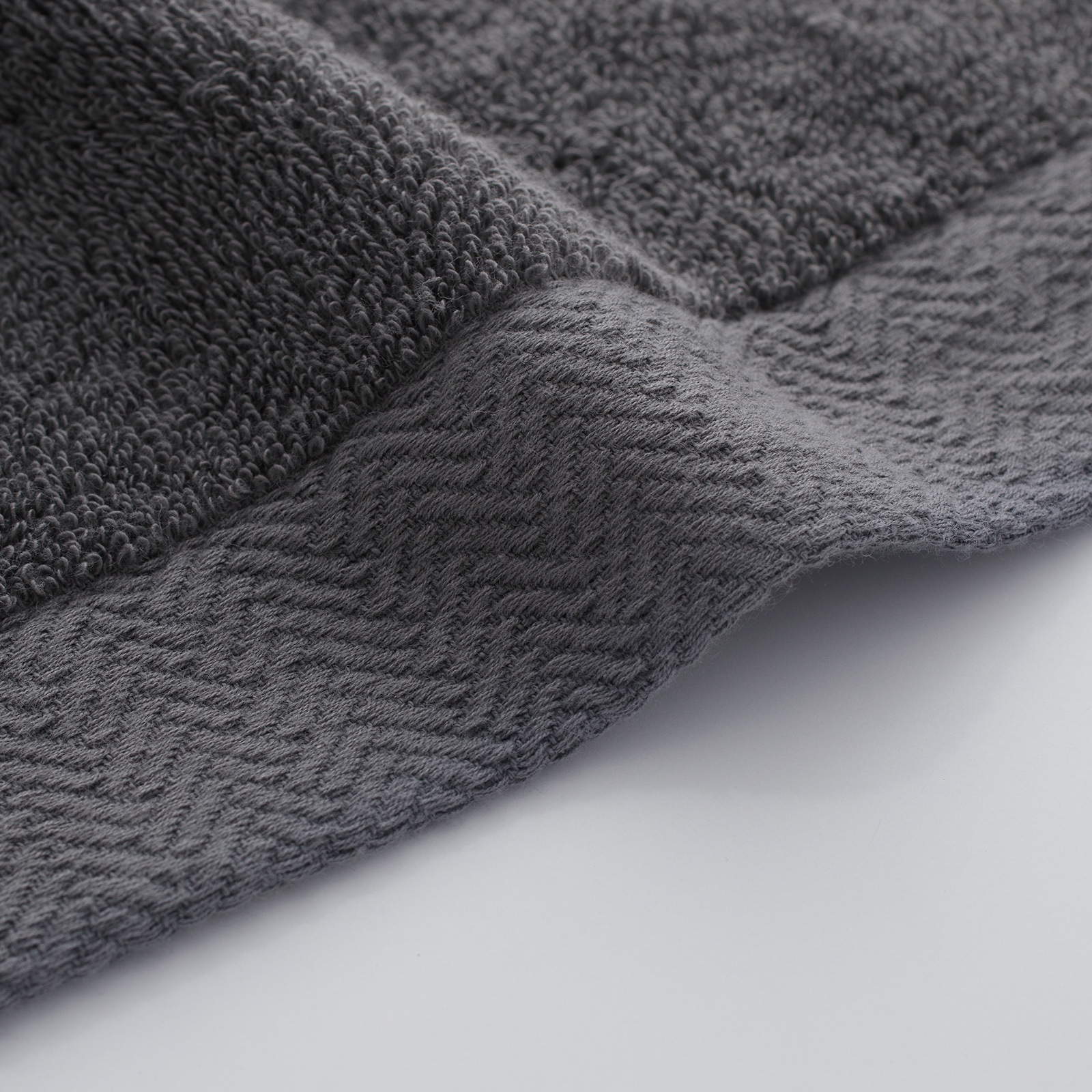 ヘム(ふち)の片方には織りで表現したヘリンボーンをあしらい、モダンでシックな印象に仕上げました。