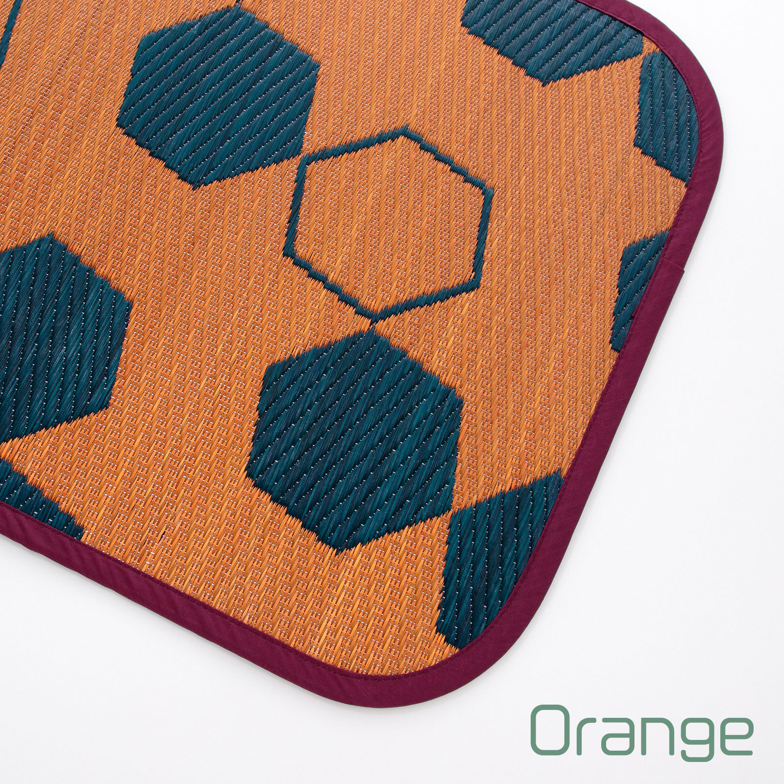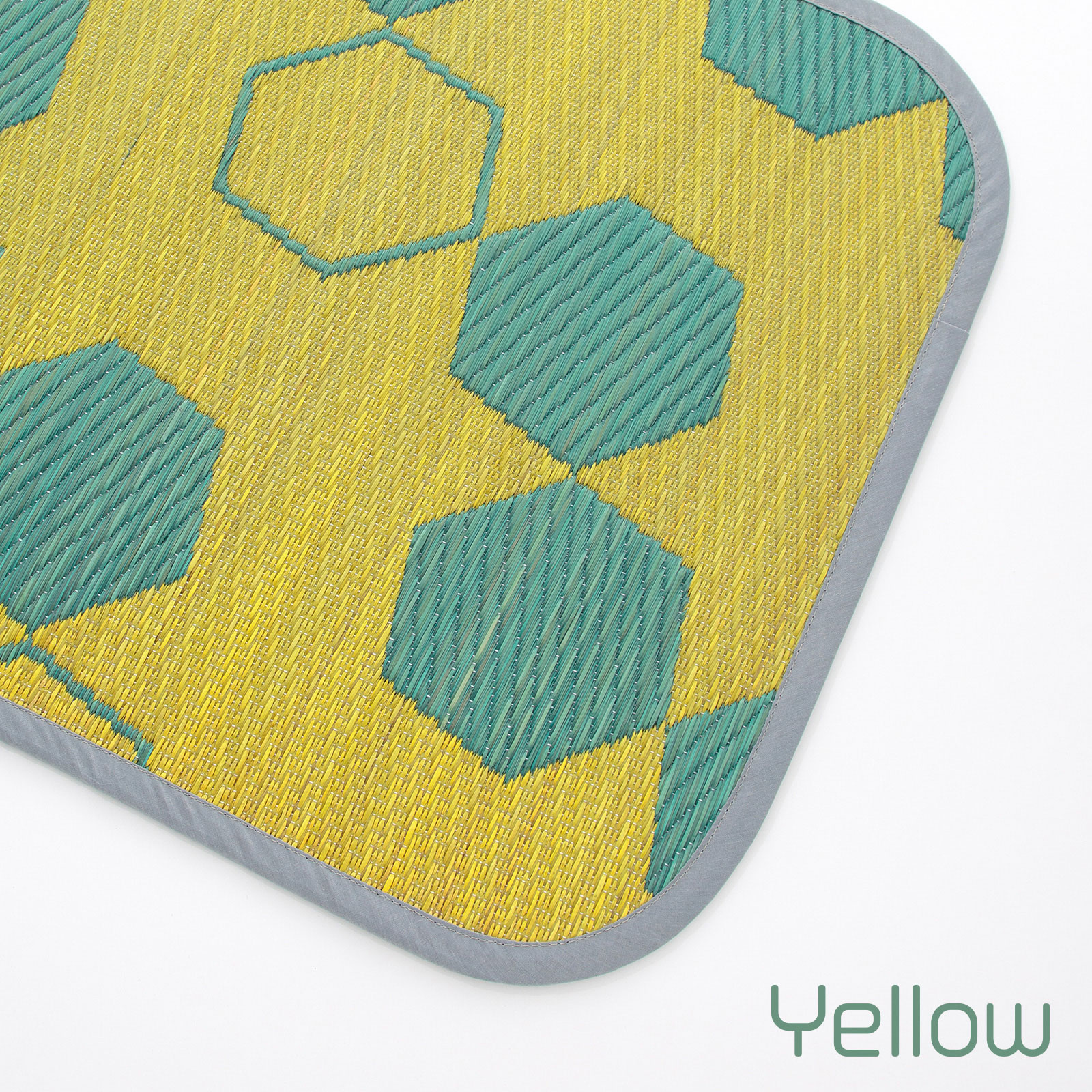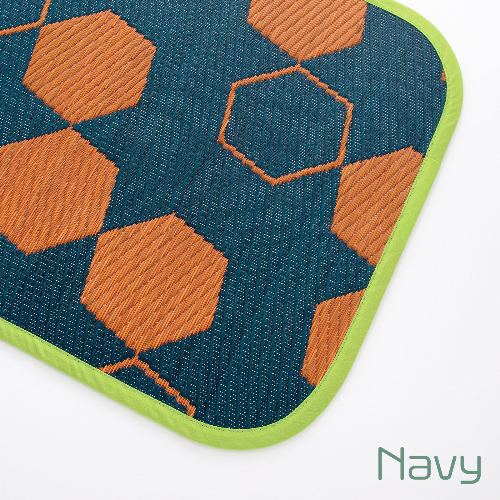 モダンでポップなハニカム柄をあしらった、い草ならではの機能性と心地よさを感じるインテリアマット。お部屋をぱっと明るくするイエロー配色と、落ち着いた印象のネイビー配色のカラーバリエーション。そして、職人の手仕事による美しい織り。