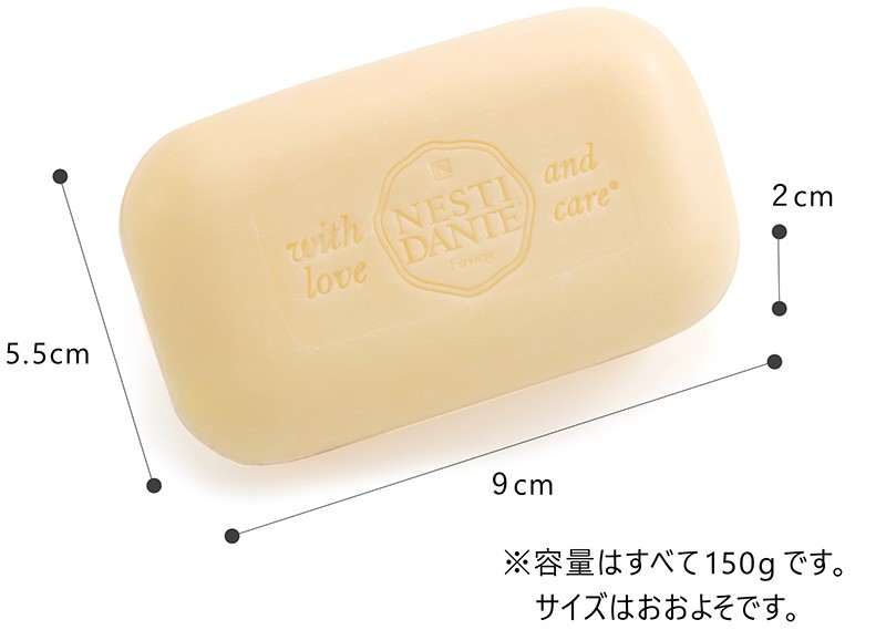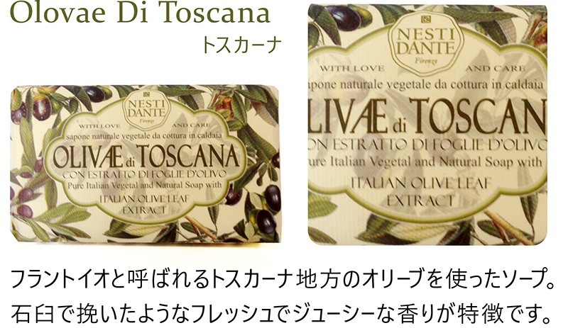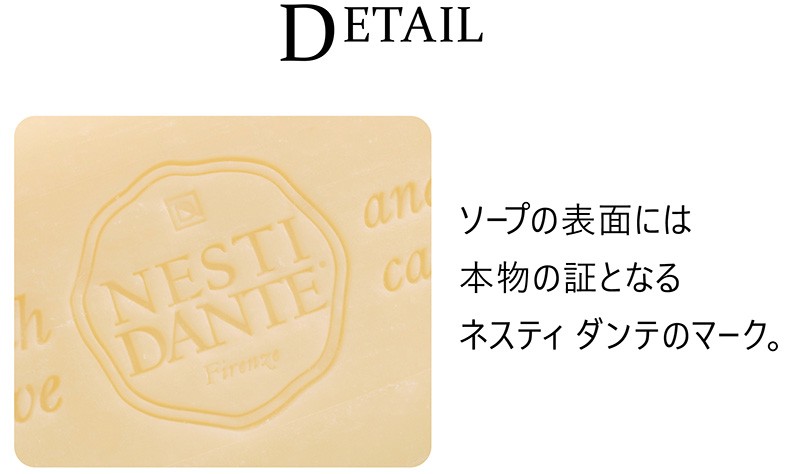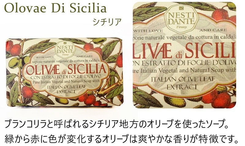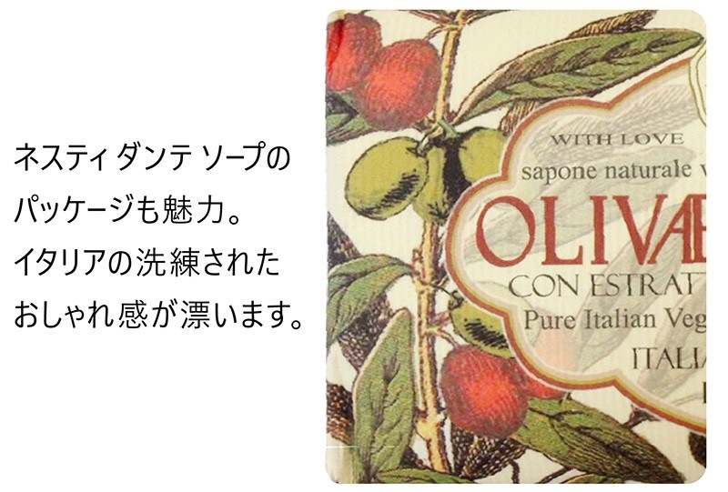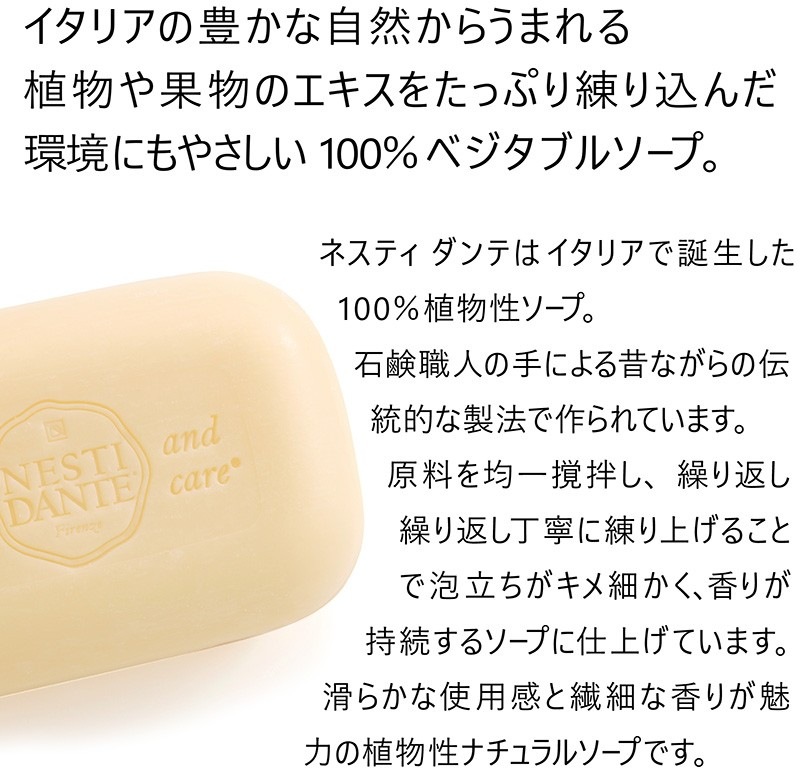 イタリアの豊かな自然からうまれるフラワーエキスやフルーツエキスをふんだんに練り込んだ100%植物性ソープ。