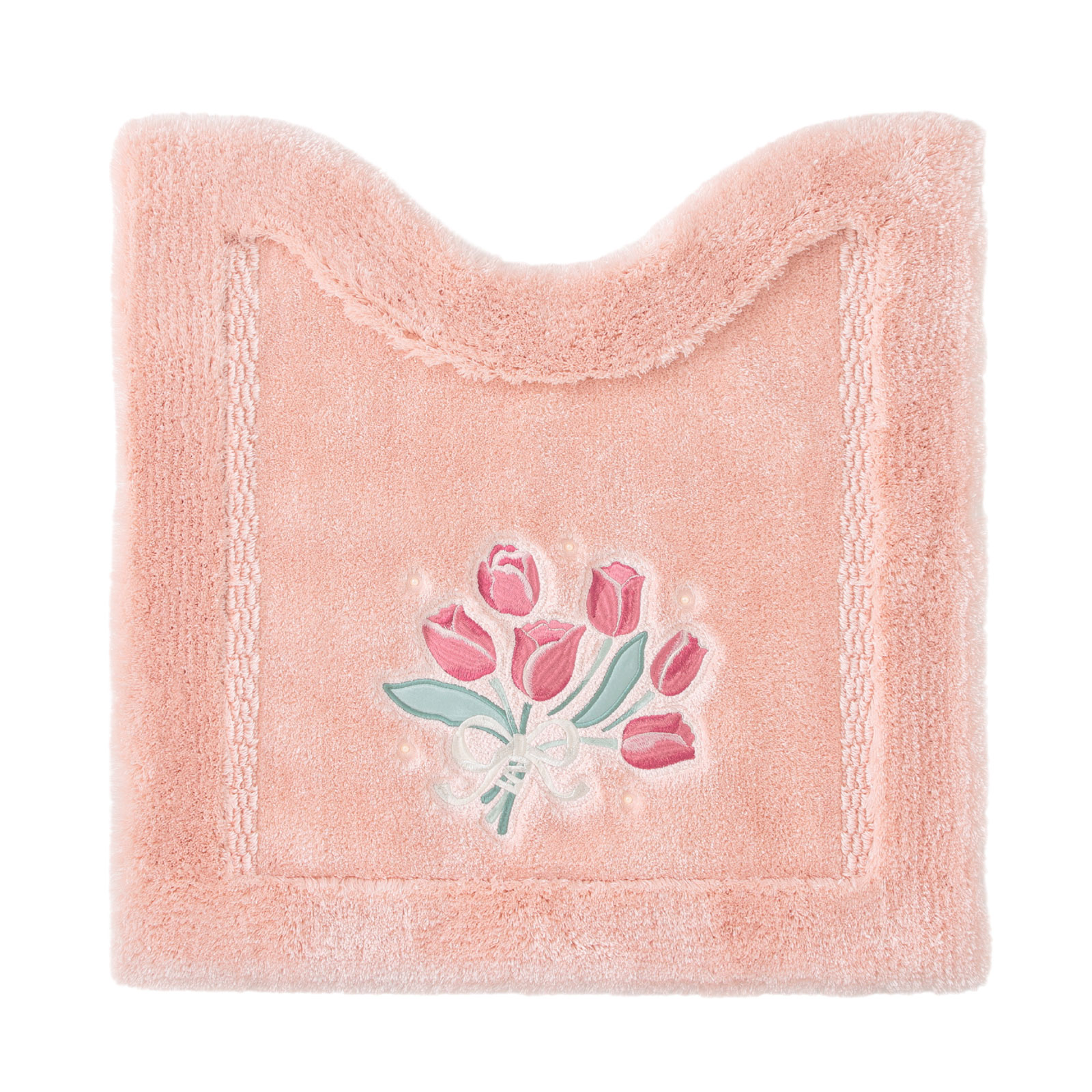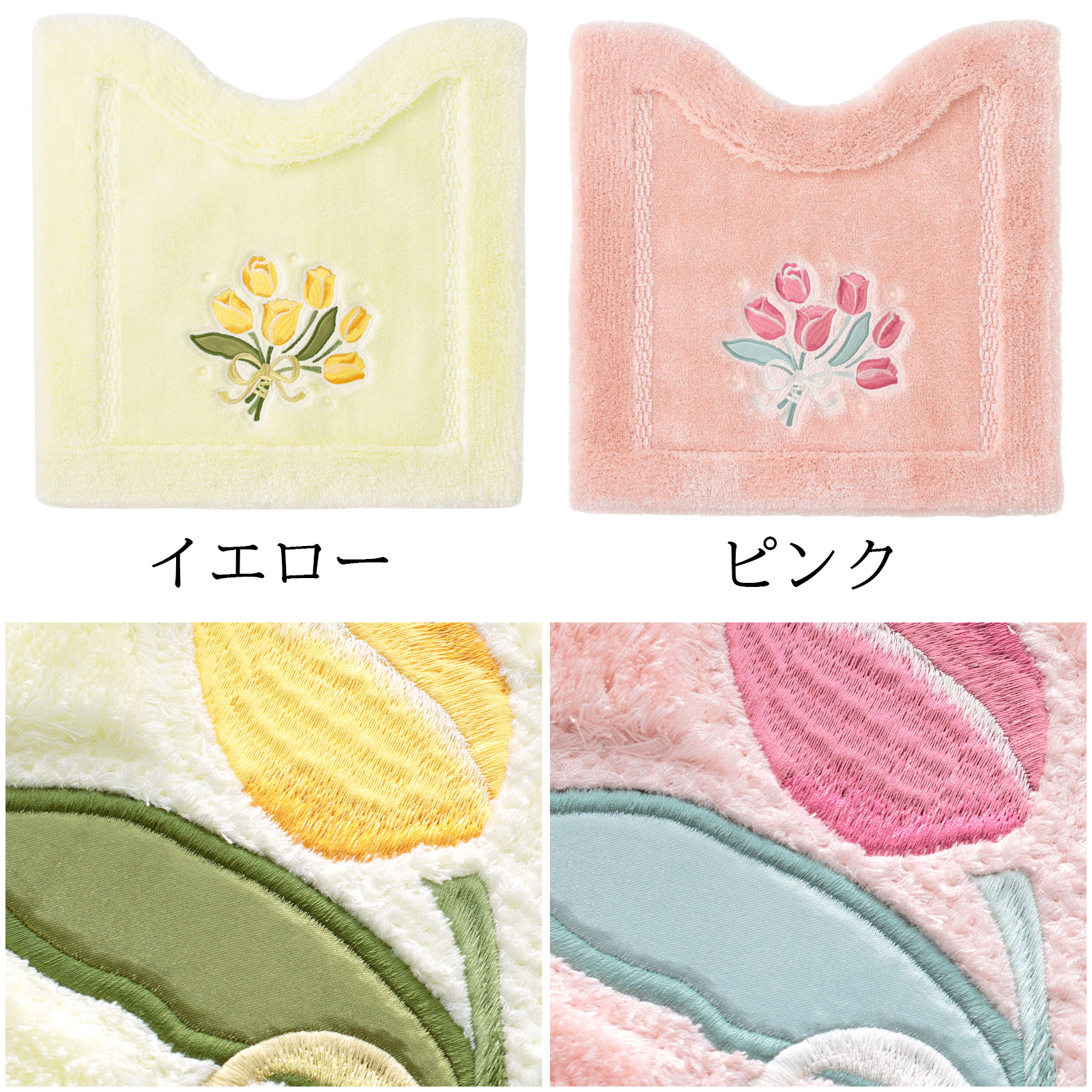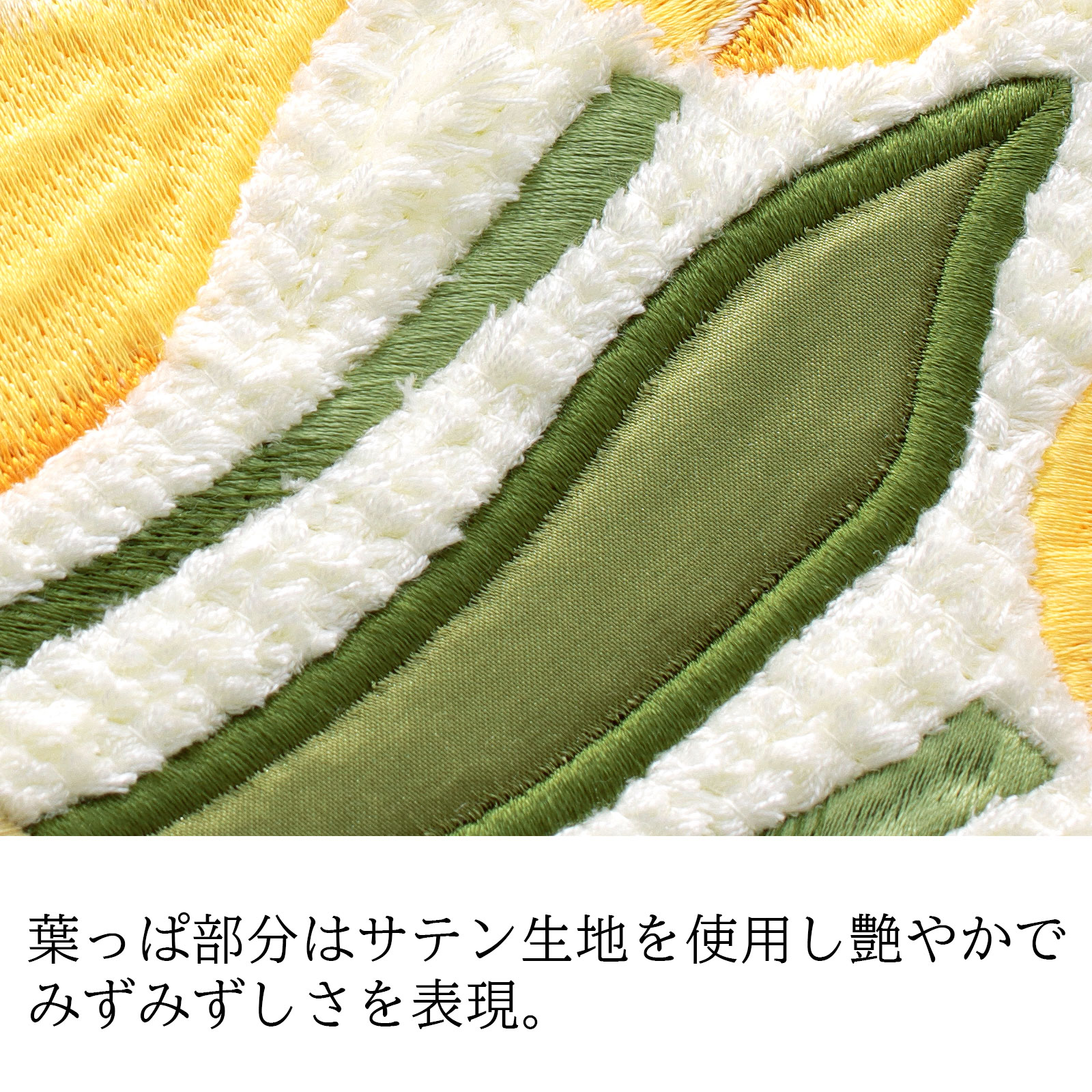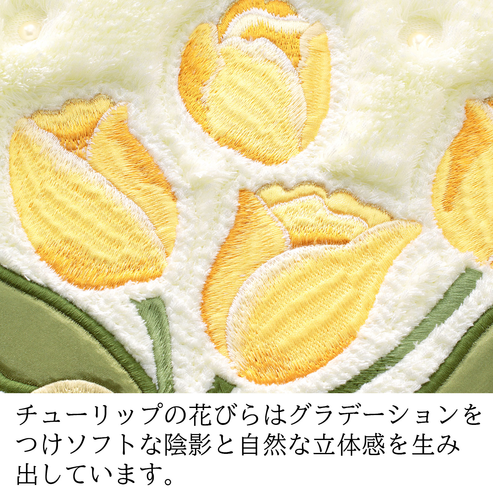 チューリップの刺しゅうに合わせて、スワロフスキーエレメンツ🄬の高品質なガラス製パールを使用。