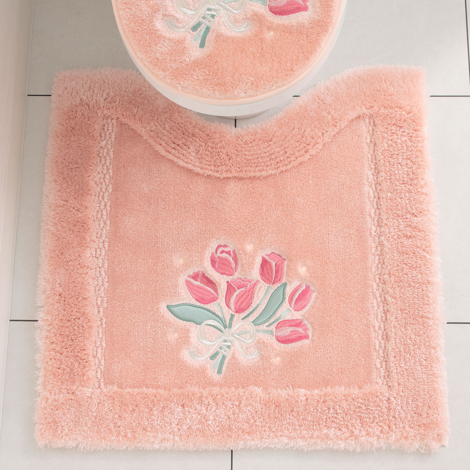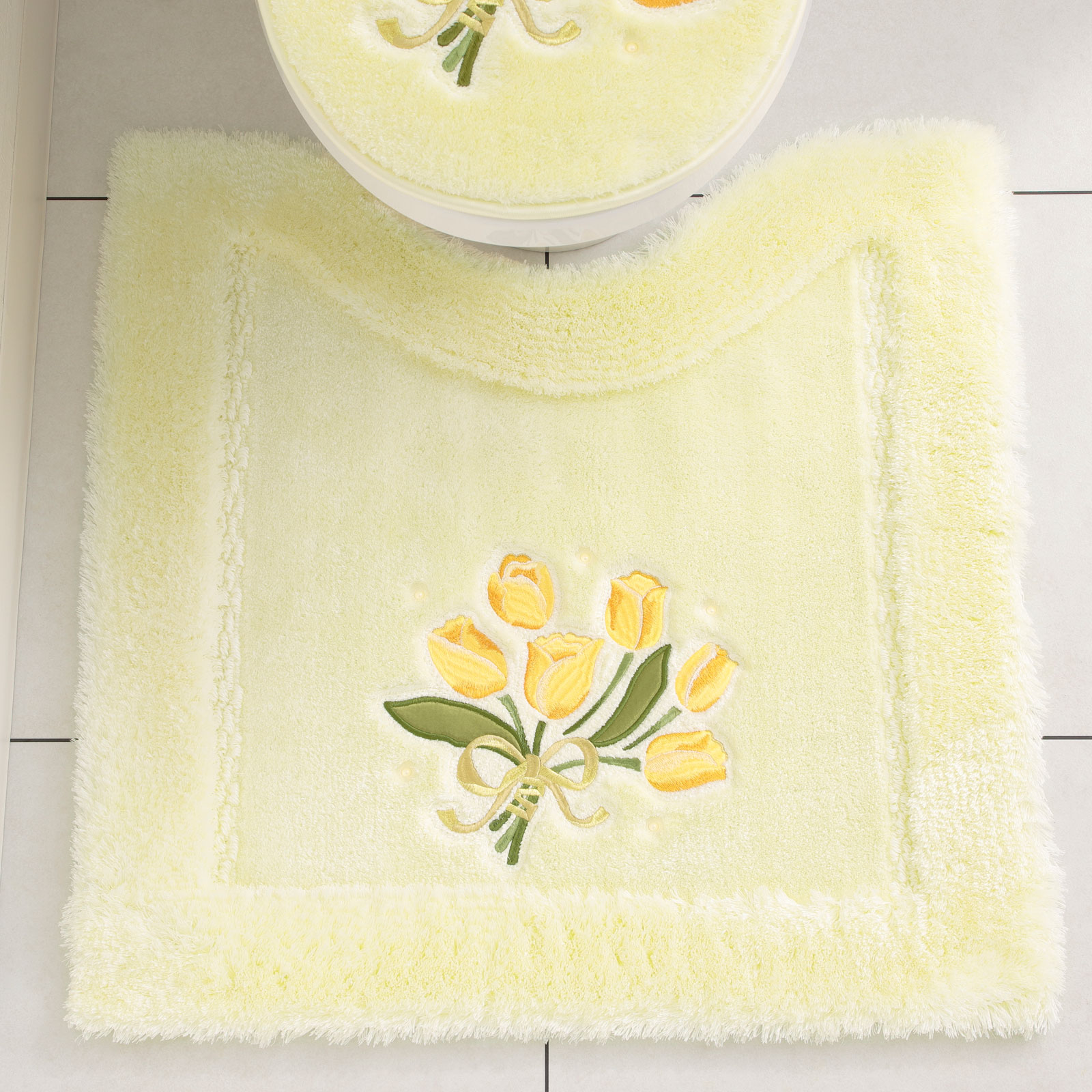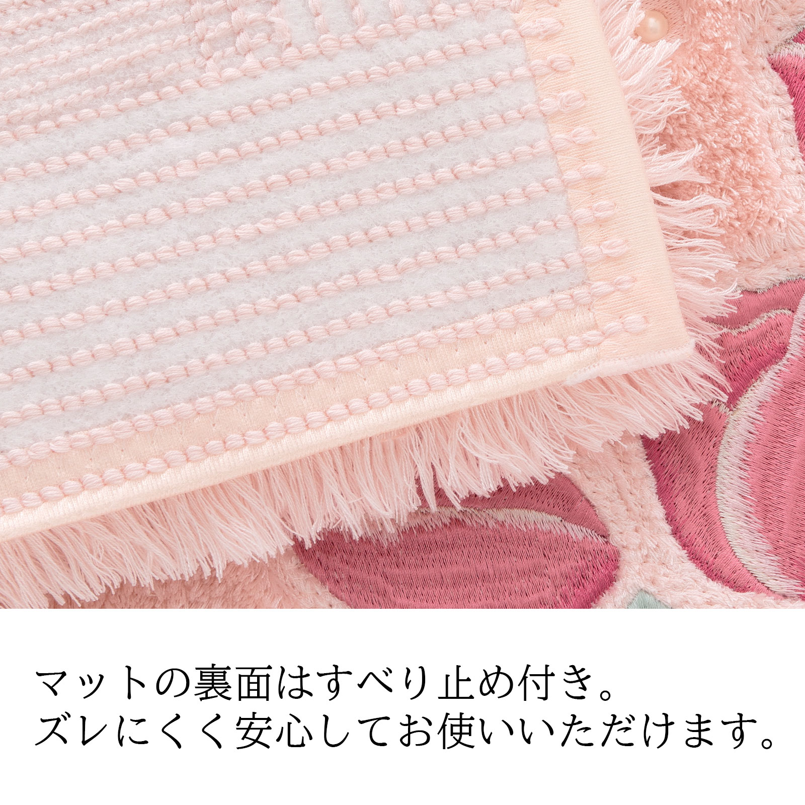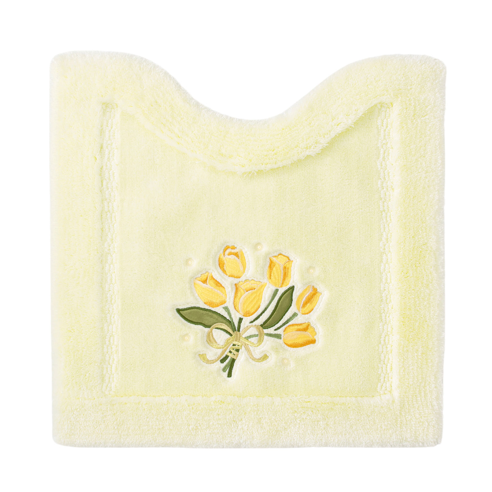 チューリップの刺しゅうに合わせて、スワロフスキーエレメンツ🄬の高品質なガラス製パールを使用。