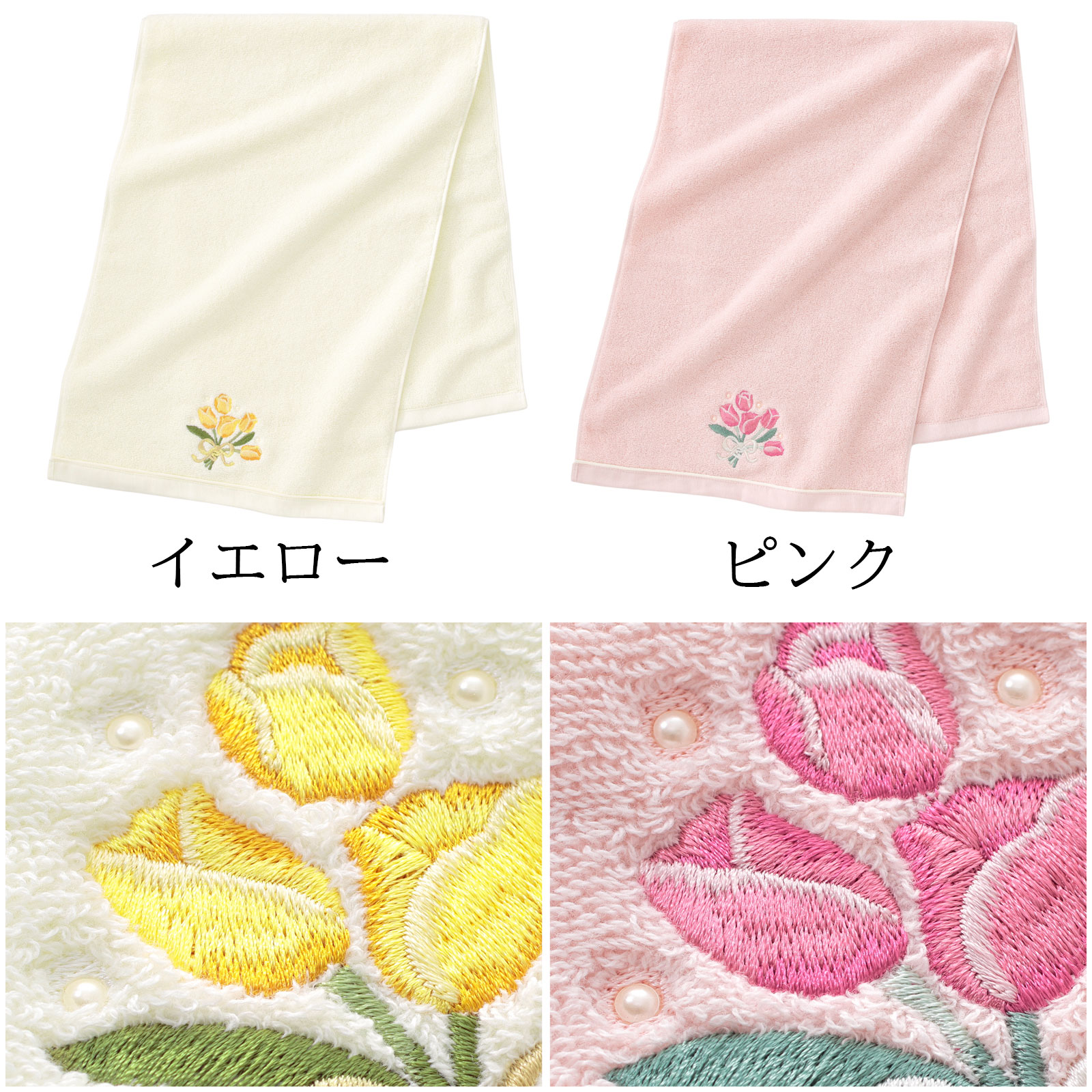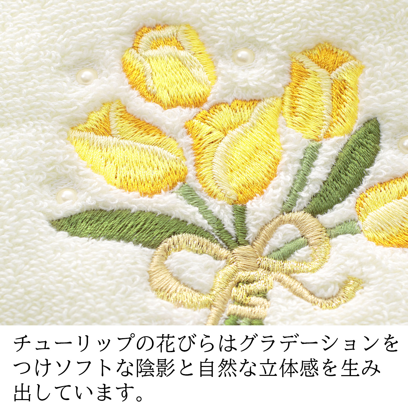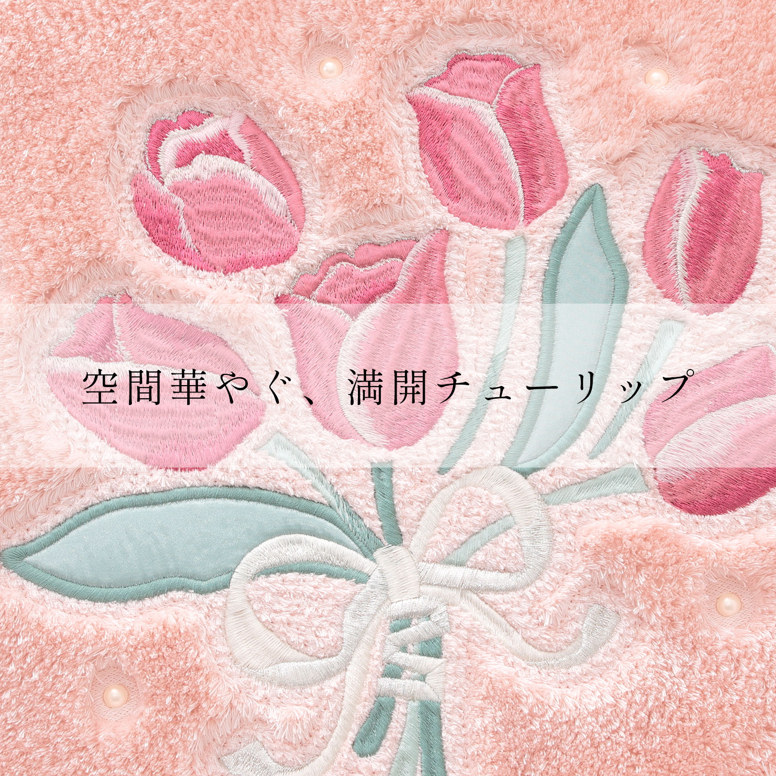 チューリップの刺しゅうに合わせて、スワロフスキーエレメンツ🄬の高品質なガラス製パールを使用。