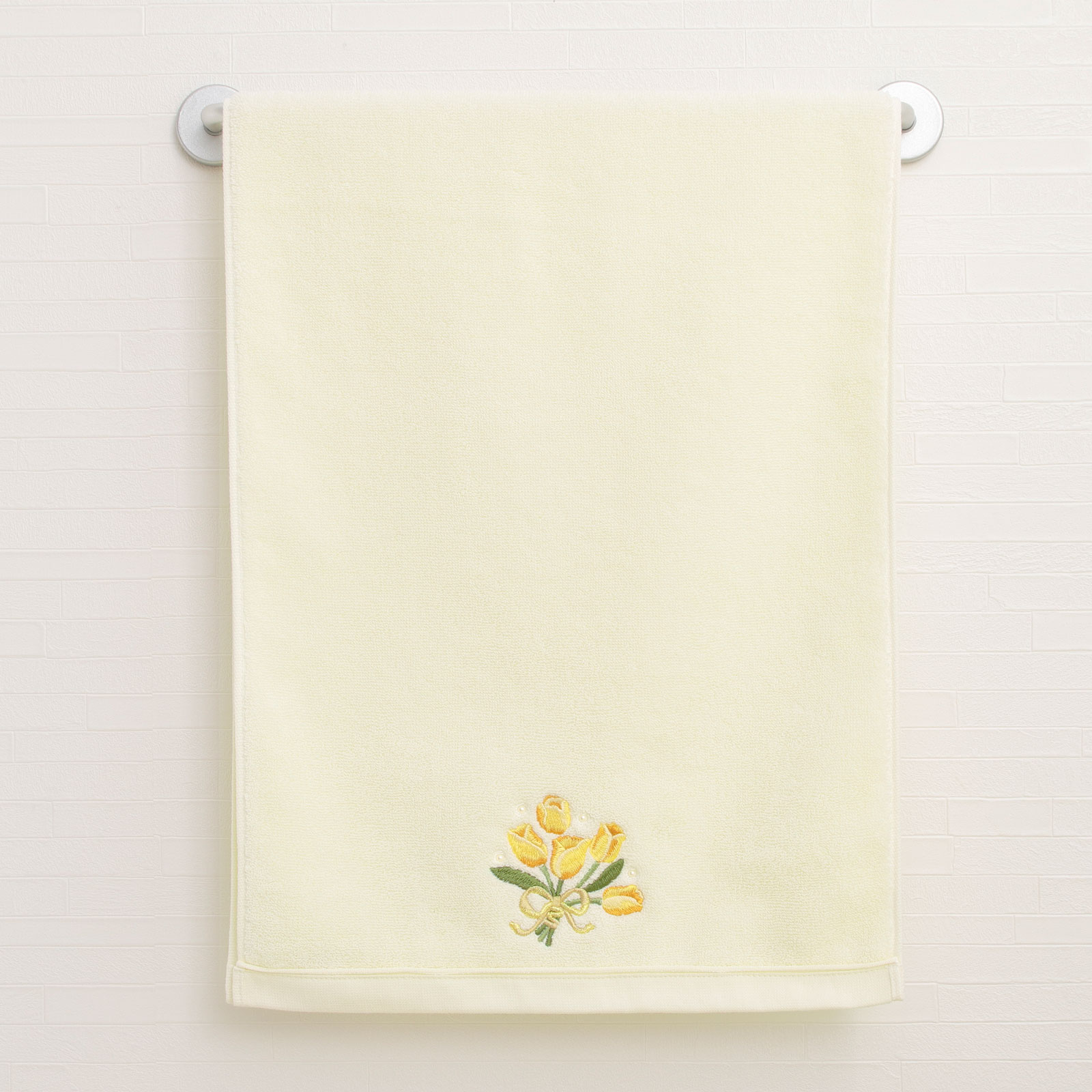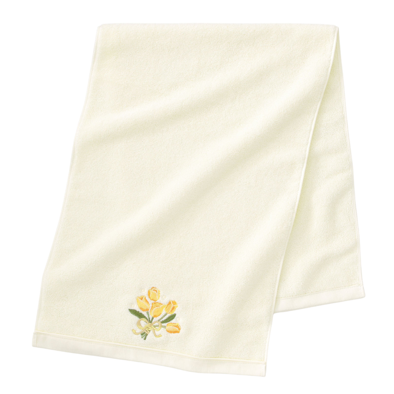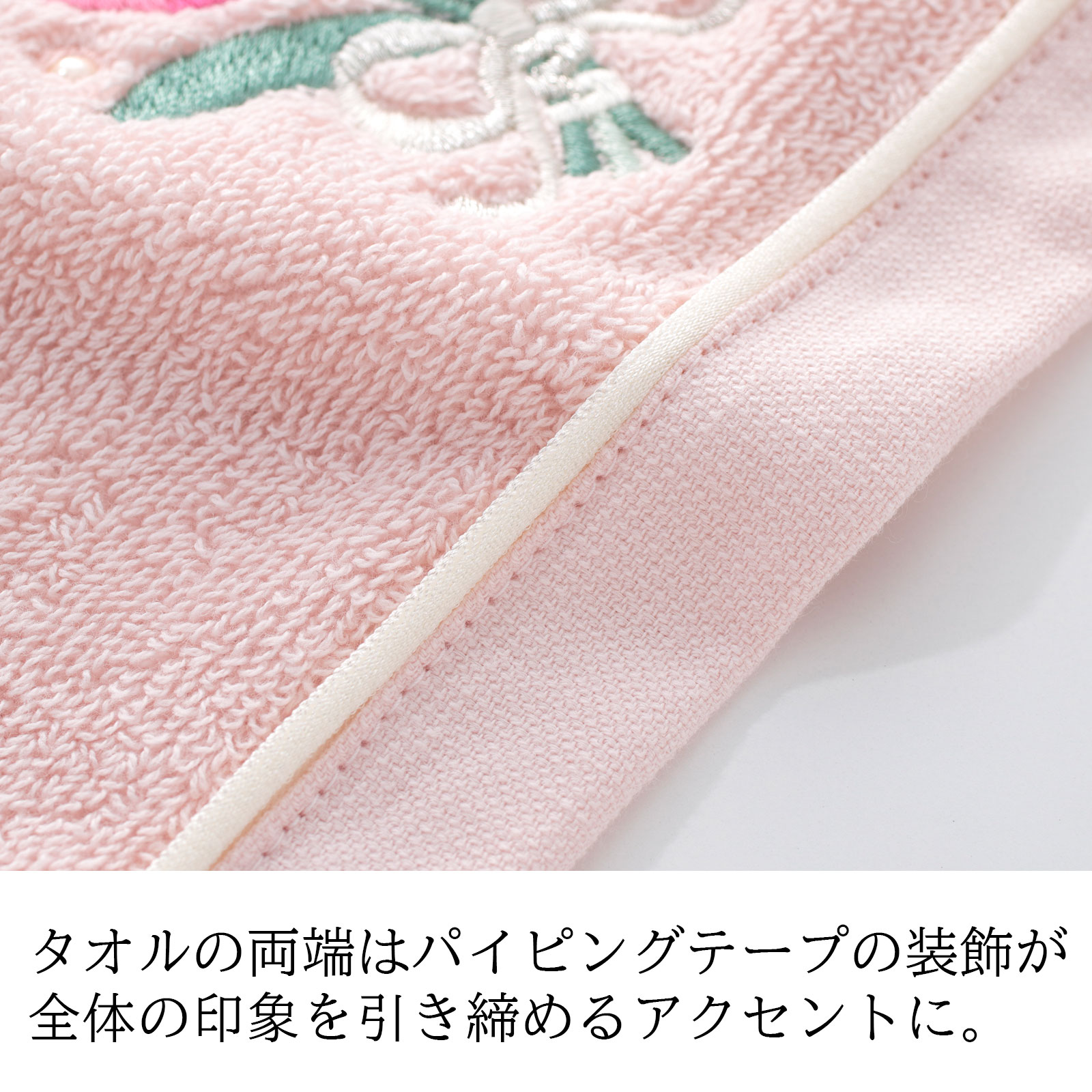 チューリップの刺しゅうに合わせて、スワロフスキーエレメンツ🄬の高品質なガラス製パールを使用。